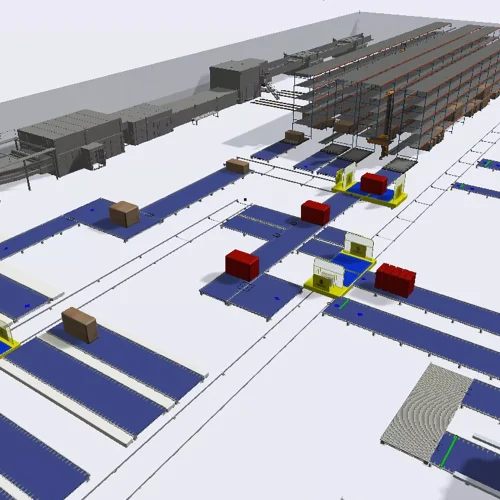 WSA has developed a customizable Digital Twin 3D simulation program which can be applied to any WSA Full Plant Conveyor Layout. The 3D simulation module will show how a given layout handles a specific order mix and specific run conditions in live streaming mode. The system includes configurable data points to show how changes in conditions effect the overall system performance and efficiency. This might include upgrading to a higher speed corrugator, adding a new high speed converting line, or adding a new Pallet Inserter etc. This allows us to reliably validate our layouts and recommend the best overall solution.